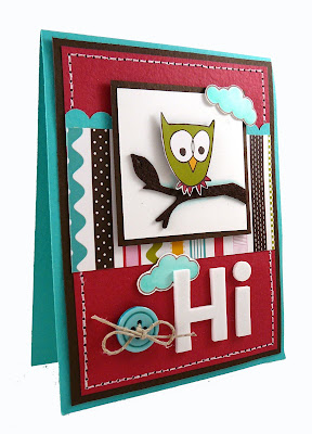OK…was that enough exclamation points for one paragraph, or what? I’ll try to calm down for the rest of my post today. This is one of those cards I made months ago that never got photographed or blogged. It’s one of the “almost no stamping” cards. The only thing I stamped were the little clouds from the Branching Out Coordinates set. The little owl was cut from one of the patterns in the American Crafts Craft Fair collection. I used a Prima felt branch for the owl’s perch, American Crafts foam thickers for the sentiment, and a button from my stash (dressed up with some twine). That’s about it! Super simple layout!