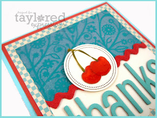 decided to pair it with the cherries from Berries and Cherries and some patterned paper that reminds me of a 70’s diner from the October Afternoon Report Card collection. I also used the same Thickers Patchwork chipboard for the sentiment. I decided I wasn’t quite through with this technique so I embossed another piece of cardstock and misted it with Lime Metallic Maya Mist so you can see the closeup of that too.