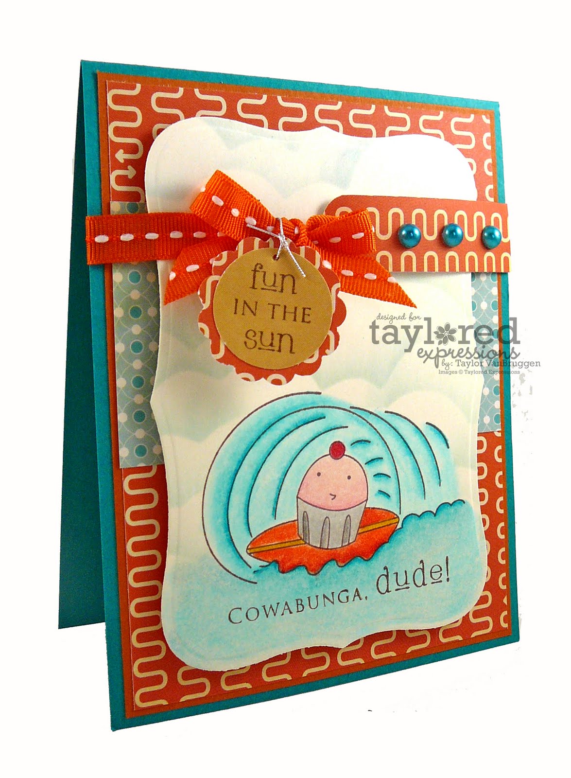 I know this post is getting super long, but I think you’ll want to hear this next announcement! Taylored Expressions is sponsoring the CPS Sketch Challenge this week! You can head over to the CPS blog to check out the fun sketch and see how you can enter to win the TE stamp set of your choice! This is the card I created using the sketch. I was feeling in a summer mood so I grabbed my Beach Bum stamp set for the sketch card. It’s hard to see in the photo, but I sponged a cloudy sky over Cuppie. And I decided to mix it up a bit and get out my Prismacolor pencils to color the image. The patterned paper is from the Cosmo Cricket Joy Ride collection.