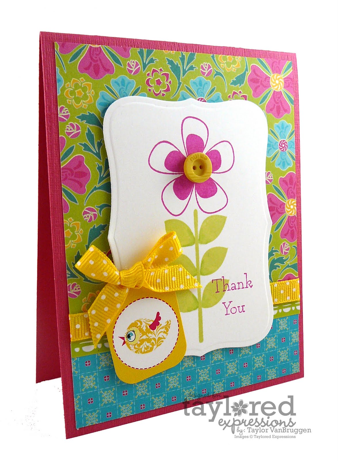 For my second card I wanted to make a sticker the focal part of my card. I love this ‘bloom’ circle sticker and with a little layering, some popping with foam tape, and a small button, I think it makes a pretty cute image! I added another border sticker at the bottom along with yellow double-edge polka dot ribbon. Don’t the bright colors in this patterned paper put you in the