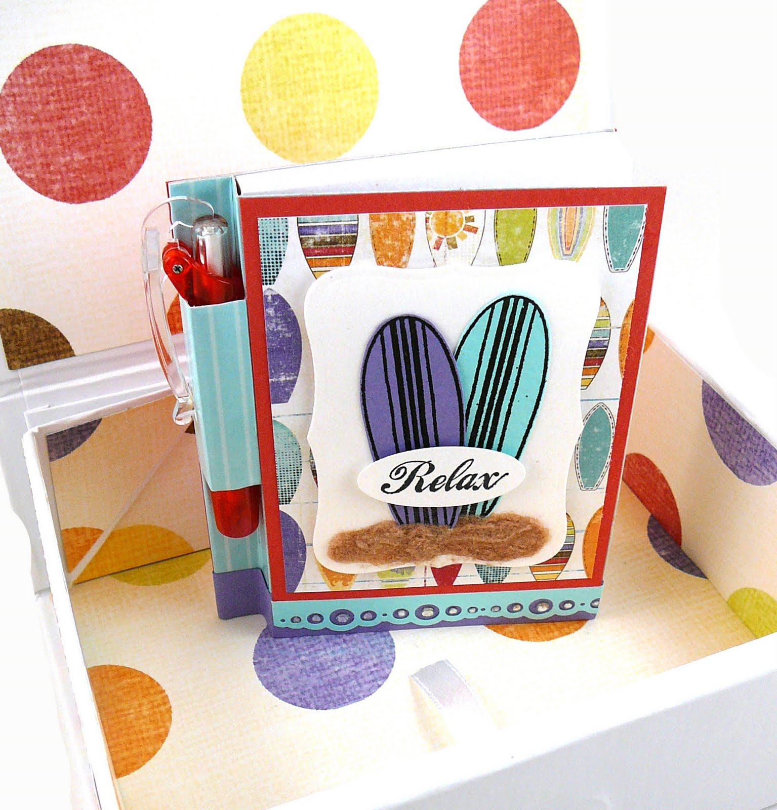 Now for the nitty gritty details on the outside of the box. I used patterned paper and a coordinating button from the Fancy Pants Rusted Sun collection. The wave pattern, sentiment, and palm tree are from the Hangin’ Out at the Beach set and I cut the striped surfboard from the Rusted Sun patterned paper. I think my favorite part of the box is the detailing at the bottom. I used the Bubbles border punch and accents each circle with Crystal Tiny Twinkles. Before I discovered Embellie Gellie, I probably wouldn’t have gone to the trouble of adding the Tiny Twinkles, but this must-have tool makes it too easy not to! As you can see in the picture above, I also covered the inside of the box with patterned paper and created a mini travel journal to keep track of all the trip details!