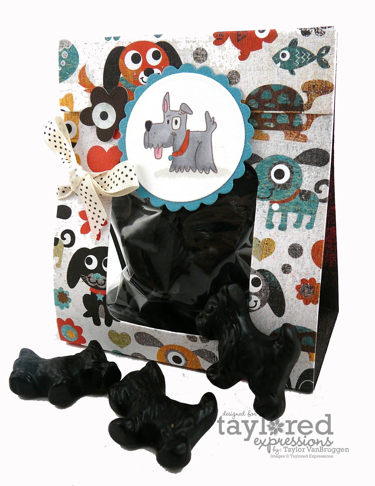 Accessories: Pet’s Place Project Pantry Kit, Copic markers, foam tape, Spellbinders Big Scalloped Rectangle, treat wrap