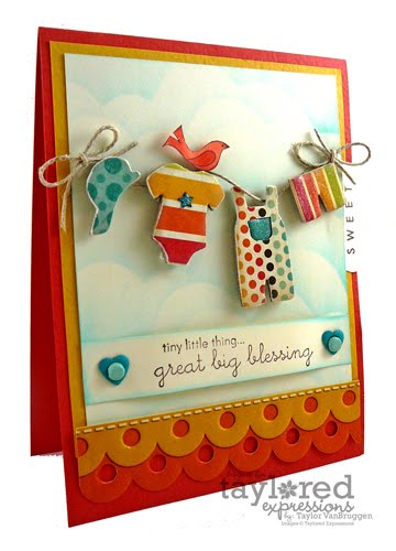 Hey Y’all! Happy Friday! Guess what arrived on the TE doorstep yesterday? A bunch of fun, new products from Maya Road, including the Laundry Day chipboard that I used on this card! I love the challenge of taking a blank piece of chipboard and creating an embellishment with character. And the Laundry Day Chipboard set goes *perfectly* with our latest Hangin’ Out and Hangin’ Out at the Beach stamp sets! The Garden Party Project Pantry kit was sitting on my desk as I went to design this card so I started by covering my chipboard shapes with patterns from the 72 & Sunny Collection from the kit. I traced around each piece, cut it out, glued it onto the chipboard, and sanded the edges. The sentiment is from the Hangin’ Out set and the little bird is from Branching Out. The double-scalloped border along the bottom is from the sheet of coordinating stickers that comes in the Garden Party Project Pantry kit. And it’s hard to see in the picture, but I used a template to sponge the cloudy background. Then to finish it all off I highlighted portions of each piece of chipboard with Illuminate Smooch… a yummy little top-coat! Thanks for stopping by to check out the challenge today! I hope you all have a wonderful weekend!