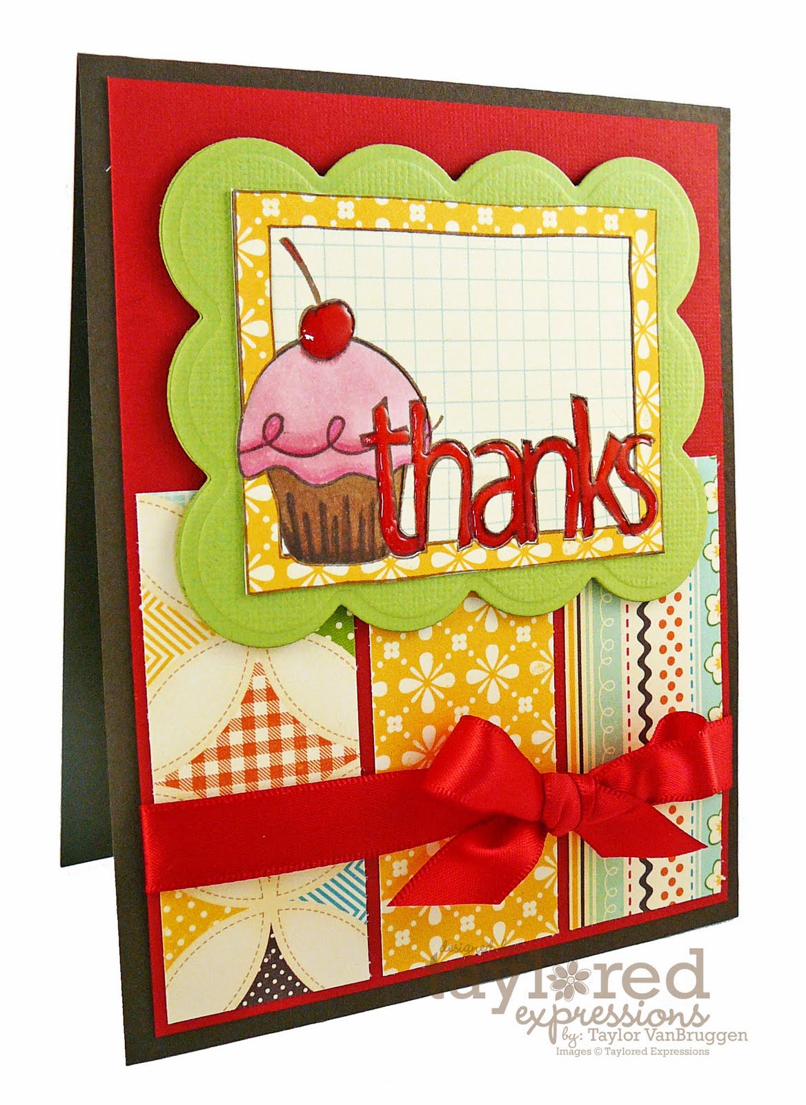Good morning! Well, it’s true… I only clean up my stamp desk once every couple weeks so the June Key Ingredients kit contents are still spread out on my desktop! I’m so drawn to the summery colors in this paper and decided that this time I wanted to pair it with the Sweet Occasions stamp set. I started by stamping the image onto different piece of patterned paper and piecing the inside of the image as well as the frame. I colored the ‘thanks’ and the cupcake with with Copics and added Glossy Accents over the top of the letters and the cherry. I cut out the image and mounted it on a Spellbinders Big Scalloped Rectangle. With so many cute patterns in the October Afternoon Fly a Kite collection it’s hard to choose just one! So I decided to use different patterns on each of the three strips at the bottom of the card. Then I finished it off with a little satin ribbon.