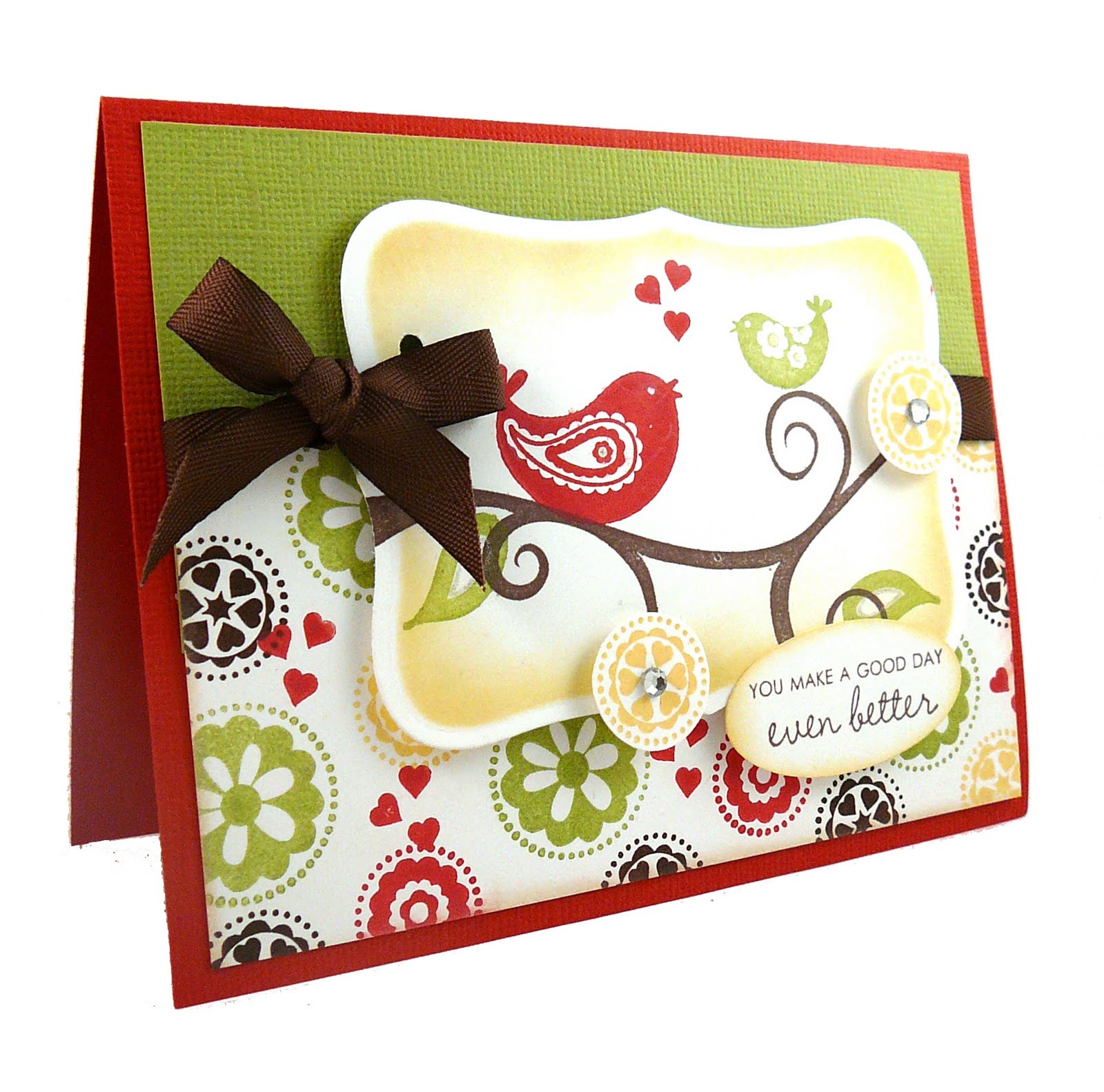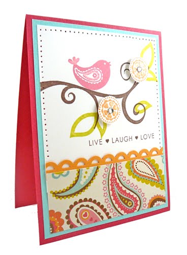 It’s a new day which means another sneak peek of a NEW stamp set from Taylored Expressions! Today the Baker’s Dozen and I are sharing projects created using Tweet Hearts, a new addition to the Whimsical Wishes collection illustrated by Nancy McKinney! As with yesterday’s new releases, this stamp set will be available for purchase Friday at 8am PST! There are so many options with the bold images in this set! For my first card I decided to create my own patterned paper. When I create my own patterned paper, I usually draw color inspiration from a piece of patterned paper in my stash. I used Pebbles Treehouse paper for my color inspiration here. After choosing inks to match, I set out stamping the