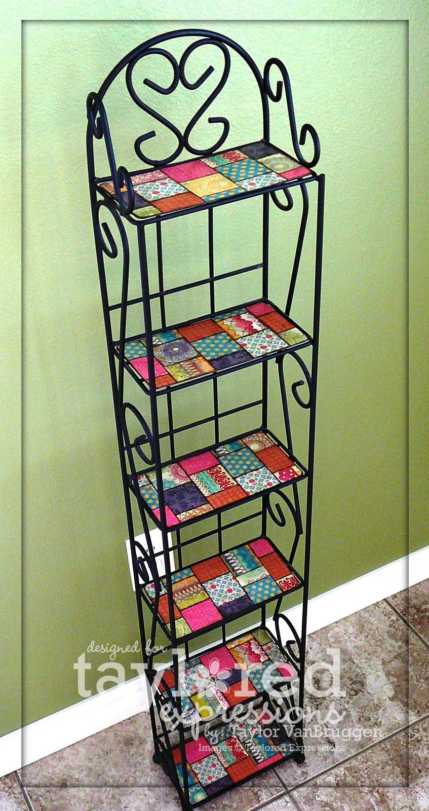 Well, I’m excited to report that after sharing my restored shelf with him he was a happy camper! When I brought the shelf home, it had no “shelves”… does that make sense? It has iron bars going across to act as shelves, but any trinket type items would fall between the cracks. So I started by cutting pieces of heavyweight chipboard to sit on top of the bars. Then I cut 2” squares from all of the different patterns in the kit and sponged around them with Dark Brown Chalk Ink. I arranged the squares onto the chipboard shelves and adhered them with Mod Podge. Then to finish it off I added a coat of Mod Podge over everything. Now I just need to find trinkets to adorn my new shelves! *grin*