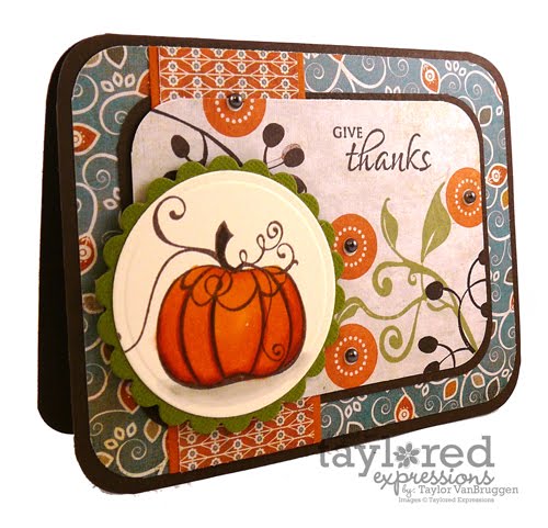As much as I complain about the coming snow and the drudges of winter, I really do love the months leading up to winter! I love the season of fall… seeing the pumpkins on porches, the leaves changing color, and the crisp air filling my lungs. It’s such a refreshing and beautiful time of year! So I decided to try to capture fall in my creation today with the Celebrate Life stamp set. This set is filled with versatile silhouette images and even a few that can be colored with Copics (like the pumpkin). I started by stamping the background images in Olive Pastel, Dark Brown, and Pumpkin Spice chalk inks. I added the sentiment and small chocolate pearls to each of the mod flower centers. Then I stamped the pumpkin, colored it in with Copics, and cut it out with Spellbinders. I’ve been waiting for the perfect opportunity to use the new Basic Grey Pyrus 6×6 pad that I’ve been hoarding and this card provided it. I matched up patterns from the paper pad (along with Suede Brown Dark and Papaya Puree Dark cardstock) in keeping with the sketch. I popped the pumpkin up on foam squares and called it good!
