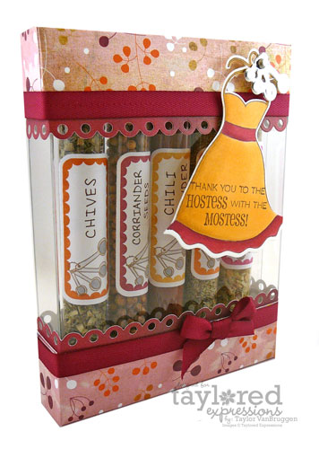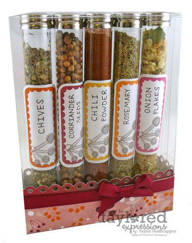 During this time of year there are lots of holiday parties and dinner invitations as we all look for more excuses to eat pumpkin pie! My mom always taught me never to show up at a dinner without a hostess gift. I often keep tea towels, candles, and wine on hand for hostess gifts, but I thought it might be fun to create a spice’y’ hostess gift with our test tubes! I started by filling five test tubes with spices like chili powder and chives. I created labels for each of the tubes by stamping the scalloped label from Fright Night Favors onto sticker paper and die cutting with the Favor Frame Die. I also stamped each label with the measuring spoons from What’s Cookin’. Then I put the test tubes inside a clear card box and created the toppers. You can view my video on how to create one of these test tube boxes HERE.