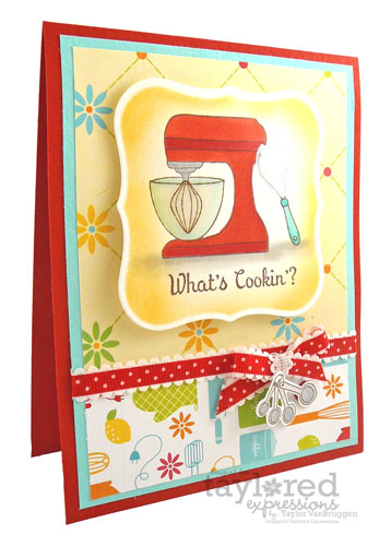 in person. The patterned papers are from the Bon Appetit collection by Doodlebug. I added some red scalloped polka dot ribbon and a bow. And now for my favorite little embellishment… do you see the measuring spoons? I stamped and colored them with Copics and then die cut them with one of the dies in our Kitchen Accessories die set. The I just punched a little hole in the top and tied it onto the ribbon like a charm.