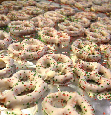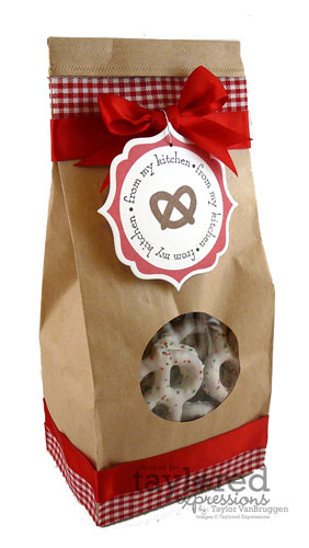 I know I’ve mentioned that one of our holiday traditions is dipping pretzels! I never get tired of candy coated pretzels (mmm…the sweet and salty) and I’m always searching for new ways to package them up and give them away to friends and family. I started a little early this year and dipped these pretzels over the weekend adding some red and green sprinkles. I grabbed one of my Mini Kraft Bakery Bags…they’re the perfect size for packaging up just the right amount of this sweet treat. I started by wrapping Peppermint Fabric Tape around the top and bottom of the bag as well as red satin ribbon. The fabric tape is self-adhesive and I used 1/2″ Sticky Tape to adhere the satin ribbon. Then I stamped the frame image in Warm Red Colorbox Chalk ink and die cut it with the coordinating From the Heart Frame die. I stamped the ‘from my kitchen’ sentiment ring inside along with the pretzel to coordinate with my gift. I tied the tag on with twine to finish it off.