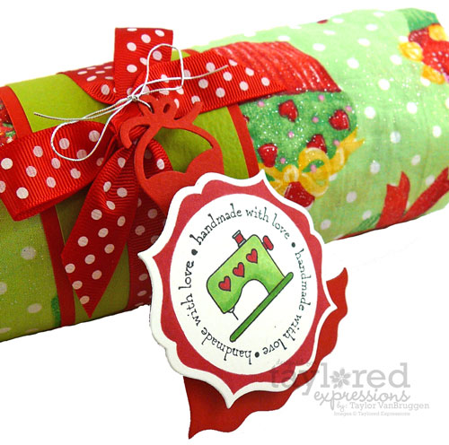 I’m sure by now you’re all familiar with the holiday cupcake apron that I wore during our recent video series. Before we mail off the apron to our winner, I wanted to create a special tag for it. The apron was hand-made by my amazing mom so I thought the sewing machine was appropriate for the tag. I also had to use the apron die we introduced yesterday because it’s just too perfect for an apron gift! So those are the three gift tags I created using From the Heart which means there are still sixteen more images to explore in the set!