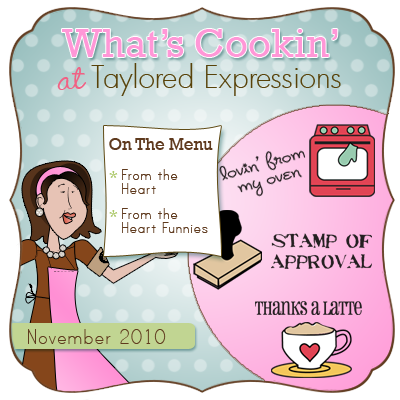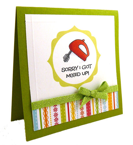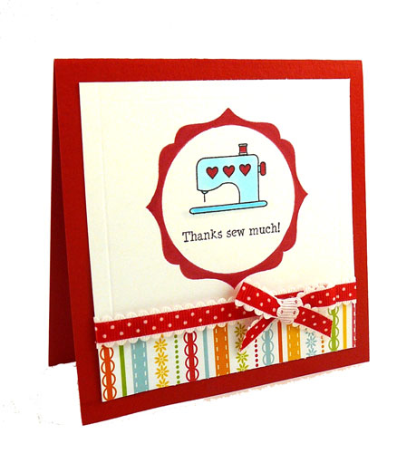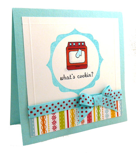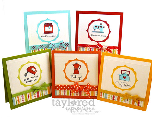 Before you head off to check out what the rest of the Baker’s Dozen has created, I want to show you the set of cards I made using the mini companion set, From the Heart Funnies. Adding these fun sentiments to the images in the From the Heart set expands the possibilities! I used a small strip of patterned paper from the Bon Appetit collection by Doodlebug. Each of the cards is sized 4.25″ square and I added ribbon and a small bow to each one. The cardstock and ink colors are as follows: