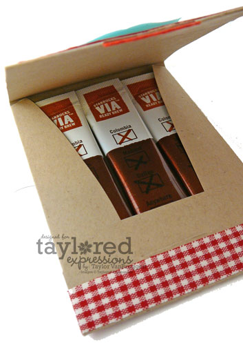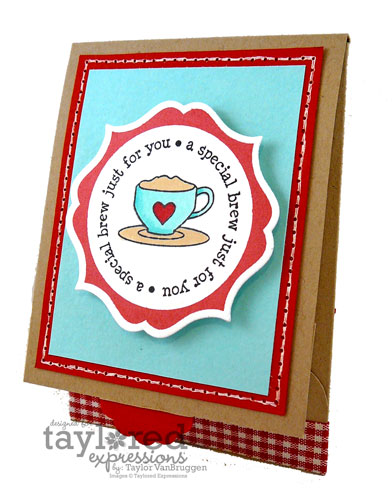 I was feeling inspired to create another project and while I don’t drink coffee, I have lots of friends and family who can’t begin a day without a least one cup! I saw these Starbucks Via packets at Target recently and was more intrigued by the little pouch than the coffee itself so I decided to create my own pouch. I used Kraft cardstock to make the base of the pouch and embellished it with Peppermint Fabric Tape. I stamped the frame, sentiment ring, and coffee cup image and colored it with Copics. I think this little pouch would be a fun gift in place of a Starbucks Gift Card! It’s Starbuck’s fresh from your own coffee maker!