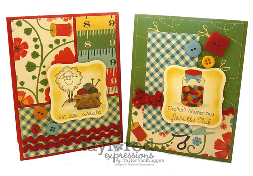 I started with two sketches from the TESC sketch book along with patterned paper from the Material Girl collection by Cosmo Cricket. I stamped the images onto our Choice Buttercream cardstock and colored them in with Copics to match the patterned papers. Then I cut them out with Spellbinders Labels 1 and sponged around the inside with Colorbox Yellow Ochre chalk ink. Apparently I was in a “buttoney” mood because I added lots of buttons and a little bit of ric rac to each card! Now if you’re still curious about the new Petites I’ve created this video to compare all four of the different sized stamp sets that we offer at Taylored Expressions: