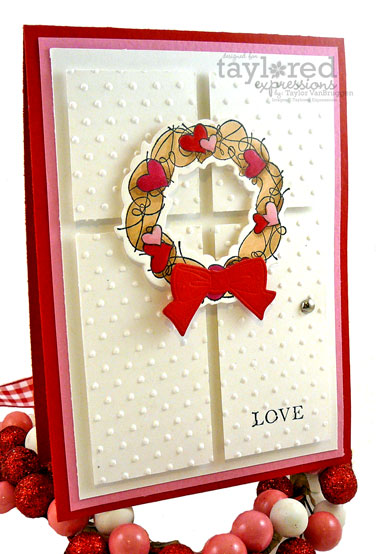 Next up is the card I made with the Wreath of Love Petite set! I always try to be festive with the front door of our home. Right now we still have this Christmas tree decal on it because I just can’t bear to take it down yet. So before I change the door decor I thought I’d do a little mock-up with this card! I started by cutting four rectangles. You could get really fancy and score each piece to look beveled, but I decided to emboss them with my Swiss Dot folder. Then I added a silver brad for the doorknob, a sentiment at the bottom, and popped each rectangle up on foam tape. Then I stamped the wreath in Memento Tuxedo Black and colored it with Copics. I cut the wreath out with our new wreath die and added a bow using with the dual cut & emboss basic bow die. I covered each heart with Glossy Accents and popped the wreath up on foam tape. A super simple way to send some love to people who might not make it to see your front door! *wink*
