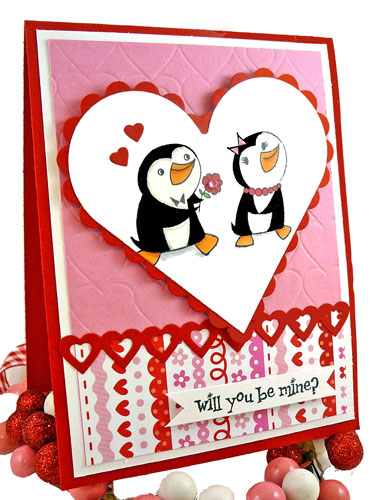 I’ll start off with the Penguin card I created using the Will You Be Mine? Petite set. I started by stamping the image in Memento Tuxedo Black and coloring it in with Copics. One nice thing about these penguins is that there’s not much coloring to do since the penguin body is solid and stamps black. Don’t get me wrong though, I love to color, but sometimes it’s just nice not to have to do it every time! I cut the image out with a Spellbinders Classic Heart and layered it onto the Scalloped Heart. The patterned paper I used is from the new Doodlebug Sweet Love collection. If you look closely, you can see the new Hearts Impression plate on the pink layer. I LOVE both of our impression plates and find myself reaching for them all the time! We debuted the collection last month with the Scallops & Circles plate and you can check out our how-to video here. I also used our new Heart Border die on this card. The heart chain is a super fun way to dress up any Valentine creation! I adhered a few of the small leftover hearts from the border over Mr. Penguin’s head. So there you have it… a new border die, another impression plate, and a peek at one of the penguins!
