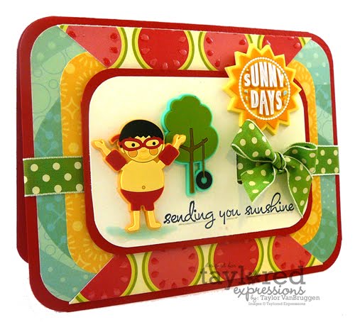 Good morning and Happy Friday! I hope you all have some stamping planned for this weekend! I’ll be stamping for our April release (sneak peeks start on Tuesday!). So are you wondering about my post title? Lemme explain! As we were shopping at the recent CHA show we came upon the Hometown Summer collection by Pink Paislee and I immediately fell in love! You all know I love bright colors and cutesy patterns so of course these patterned papers called to me from a mile away. But it’s really this sweet little boy who captured my heart… literally! This little guy with his bowl cut, round belly, goggles, and floaties reminds me of childhood pics of my sweet hubby. Although he has since shed the roundness and taken on a new hairstyle, his siblings still tease him about his husky days. So I decided to create this card as an ode to Jon and I proudly displayed it for him in his office. *grin*