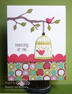 Melissa designed a beautiful card using Birds of a Feather. I love the sweet softness of the purple and all the texture she used in the design! And Jami took a totally cute and unique approach by creating her own background from the birds and birdcages. Of course, I’m drawn to the pink and black combo!