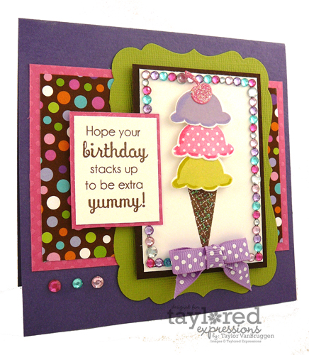 And now for the sneak peeks! Today the Baker’s Dozen and I are featuring two new stamp sets concepted by Sankari Wegman and illustrated by Nancy McKinney for the Whimsical Wishes collection. The sets are called Build a Treat & Build a Treat Borders…. can you guess what that means!? It’s like “Build a Bear” only with cupcakes and ice cream! Both of these sets have lots of coordinating dies to mix and match and create the treats of your dreams… calorie free too! *wink* Each set has options for both coloring and solid stamping making them a must for any birthday stamp collection. The Doodlebug Cake & Ice Cream patterned paper seemed to be perfect with these stamps. I started by stamping the tops in three different colors and cutting them out with the coordinating die. I stamped the cone directly onto the paper and then popped up the scoops over the top. I added a cherry die cut to the top and covered it (and the cone) with Stardust Stickles. Each of the ice cream scoops was highlighted with Smooch (Sassy Pink, Luscious Lime, and Grape Soda).