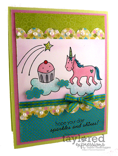 My next project uses the Happier Card Kit and the new Simply Magical Petite Set. It just doesn’t get better than Cuppie and Unicorn! Wouldn’t this make a sweet set of cards for a young girl? I also used the Medium Scalloped Border die and an Ice White Pearl Pen on each scallop for more detail. And the clouds are covered with glitter for even more sparkle and shine (just like the sentiment says!). 🙂