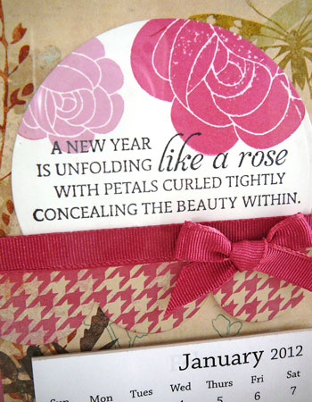 I love to have pretty things sitting out on my stamp desk, propped in the windowsills of my stamp room, and all over the shelves! It gives me inspiration and it’s a daily reminder of what I love so much about this hobby! So I decided to create a calendar just for me to enjoy in my stamp room. I’ll probably duplicate these for gifts once the 2013 calendars are available (in March), but for now this is just for me! I wanted to start the year off with a quote from the New Beginnings stamp set “A New Year is unfolding like a rose with petals curled tightly concealing the beauty within.” Love that! And it goes perfectly with the new roses from the Rosy Posey stamp set. I stamped the sentiment with Memento Tuxedo Black ink and cut it out with a circle Spellbinders die. Then I trimmed off the bottom part of the circle and stamped the roses in Berrylicious and Pink Pastel inks. The patterned paper is from the MME Vanity Fair collection and I used the Large Scallop Border die to cut out a houndstooth piece for underneath the sentiment. I layered the