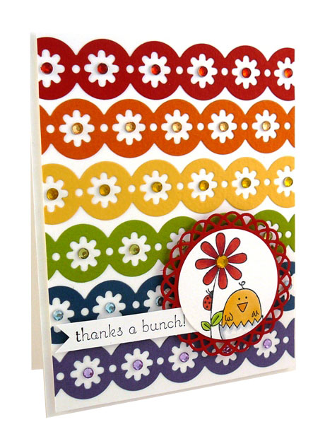 Good morning! I hope you all had a great weekend! We spent Friday and Sunday in Omaha at the NCAA basketball tournament and it was a great time! There were so many great games, but the two best games were the Norfolk State upset over Mizzou on Friday and then the awesome Kansas vs. Purdue game last night. It was a fun weekend and the weather was absolutely gorgeous (in the 80’s!) which made it even better! There were no games on Saturday so I had some time to spend in my stamp room too. The idea for this card has been rolling around in my head for a while. I love our new Jumbo Flower Border die and I’ve been wanting to do something in a rainbow color scheme with it. I started with my ROY G BIV acronym from elementary school (red, orange, yellow, green, blue, indigo, violet) and cut out the border die from cardstock. Does anybody else know ROY G BIV? I asked Jon about it this morning and he looked at me like I was crazy? Maybe they only taught that at my elementary school! LOL! I glued each border to a Choice Snow White base (4″ x 5.25″) and added the coordinating rhinestones to the center of each flower. The rhinestone colors I used were Red, Orange, Deep Yellow, Split Pea, Ice Blue, and Lilac. The Hello Spring stamp set is now back in stock at the TE Store and it seemed to be the perfect addition to the bright and sunny rainbow borders. I stamped the little scene in Memento Tuxedo Black ink, punched it out with a 1 3/4″ circle punch, and colored it with Copics. Then I layered it on the Layering Doily Die (small) and popped it up on foam tape over the top of the colorful borders. To finish it off I flagged the sentiment and adhered it underneath the image panel.