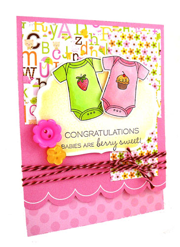 Now that y’all know about the big party tonight, let me continue on with my sneak peeks. I told you we’re celebrating moms this release and what comes with motherhood? Well, a baby of course! So today we’re sharing several baby stamp sets and some fabulous new dies to use for baby cards, baby shower ensembles, etc. I started out by grabbing the new (and simply ADORABLE) Doodlebug Sugar & Spice 6×6 pad to create a gift bag and onesie notecard/tag. I combined several of the patterned papers in strips, stamped the congratulations sentiment and flagged the end, and then wrapped Baby Girl pink and brown twine around the patterned pieces and tied on the cutest pink flower button from the Doodlebug Oodles collection. I bought these kraft gift sacks on clearance at Target. They had ugly black ribbon handles but after cutting those out and replacing them with pink stitched ribbon I made my clearance bargain into a treasure! Good thing I picked up about 20 of these bags (*wink*…don’t tell Jon!). Then I used the brand spankin’ new Onesie Notecard die to create a little card/tag