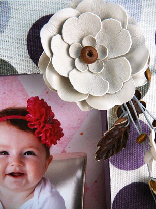I’ve been working on a re-decorating project lately as I transform our front room into a playroom for Madelyn. Since this is the first thing people walk into when they come over I want it to fit in with the rest of our decor. So I’m not doing the ‘crazy bright colored playroom’, but I’m still trying to make it cute and fun for her. I picked out some super cute purple polka dot fabric and a matching purple paisley pattern as my inspiration pieces. I’m going to have my mom make a valance and bench cushion from these fabrics and since I don’t sew I decided to cover a couple wood frames with the fabric too! The Prima Laredo Soccoro flowers were the perfect embellishment for my frame after I covered it with fabric. They’re made from a cool leathery material so I knew they’d stand the test of time. Check out the closeup below to see the texture and detailing on the flower! And of course a picture from Madelyn’s 6 month session was the perfect thing to fill the frame! *grin*