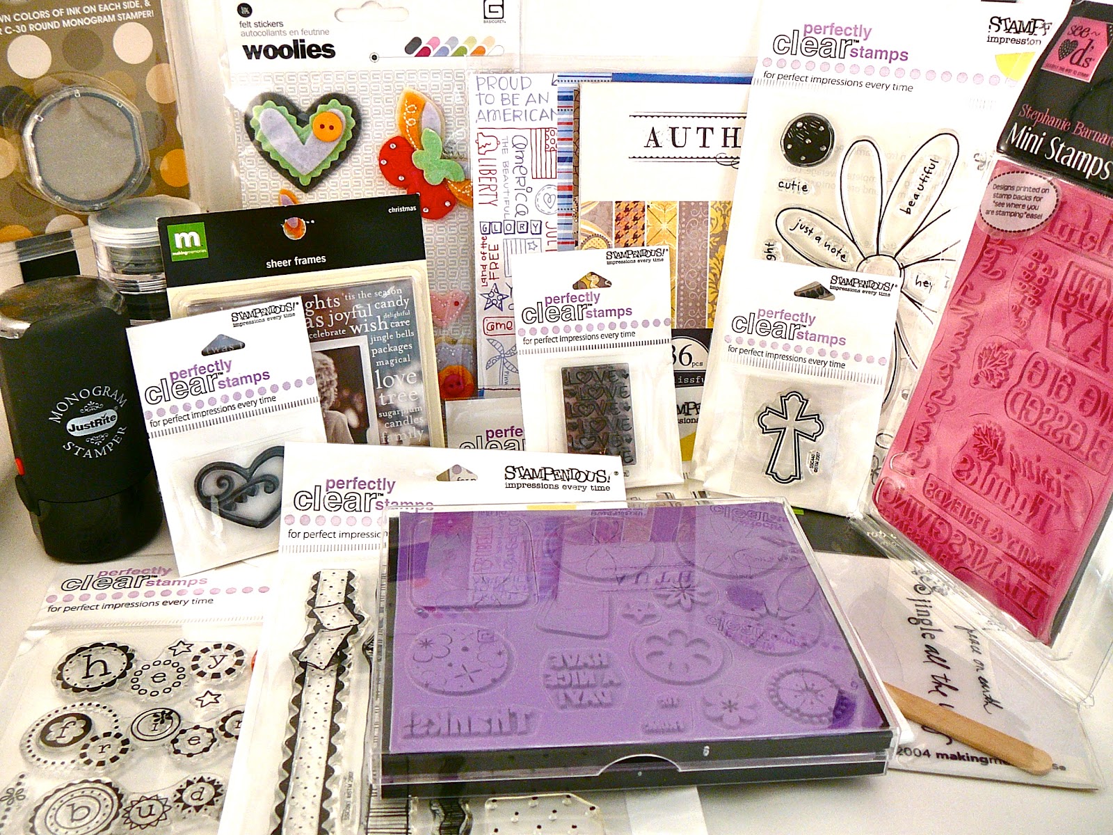 I’ve crammed more than 10 boxes FULL of crafty goodies including stamps from some of the following companies: Stampendous, My Favorite Things, Inque Boutique, Verve, Rubber Romance, Stamping Bella, PaperTrey Ink, Hambo Stamps, JustRite Stamps, The Angel Company and others! Also in each box are embellishments, patterned papers, and other random goodies that I pulled from every nook and cranny of my stamp room! Here’s a look at what’s included in just one of these boxes (there are at least 5 stamp sets in every box along with single stamps, embellishments, and paper):