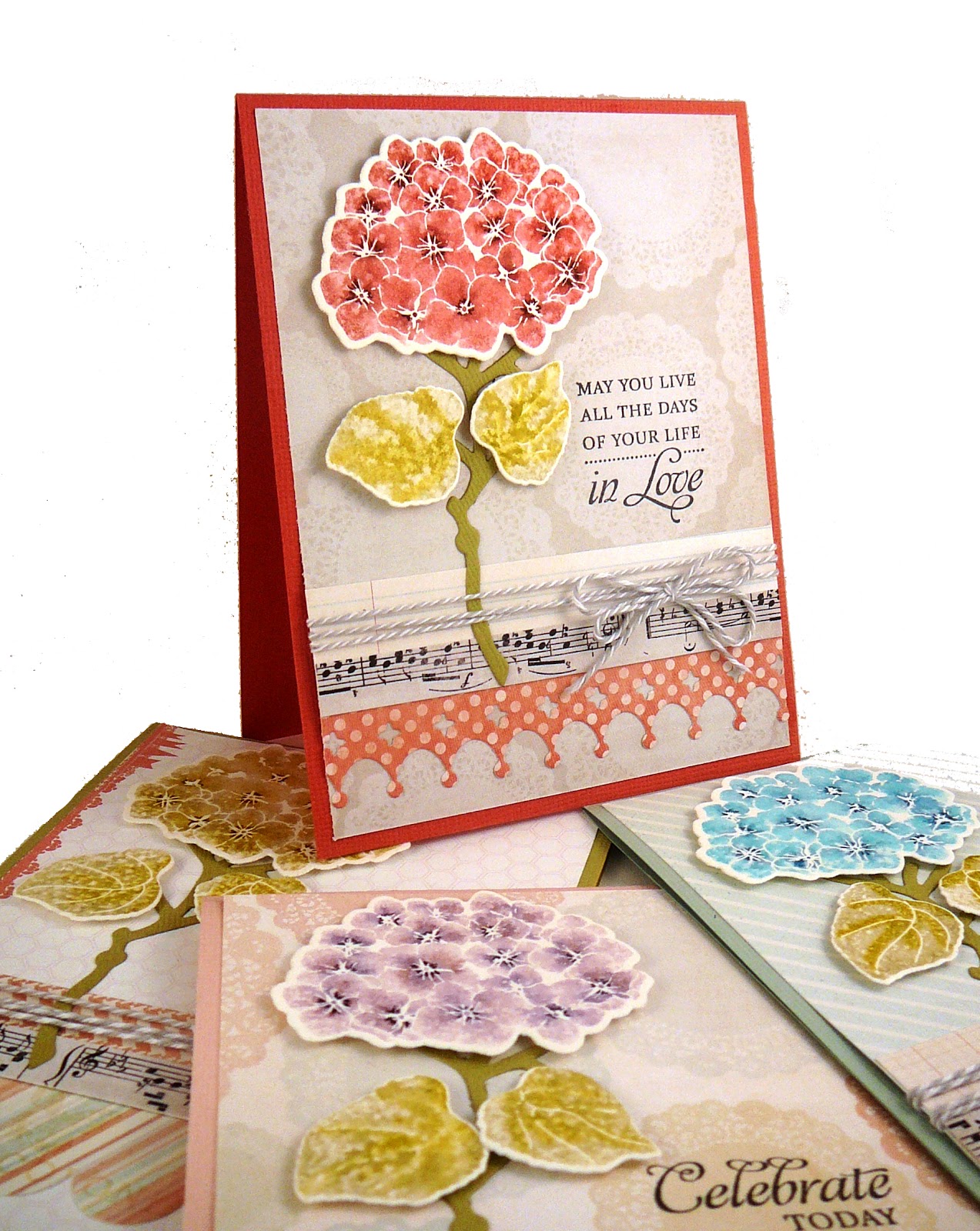 I had lots of fun piecing together the patterns from the My Mind’s Eye Be Happy collection. I also cut out the blooms and leaves with the coordinating Hydrangea Blooms dies. Other items used on these cards: Majestic Border Die, Medium Scallop Border Die, Gray Doodle Twine. All stamps and sentiments are from the Forever in Bloom set. Here’s a closeup on a couple of the stamped hydrangea blooms: