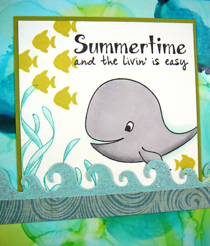 Here’s a closeup of my calendar insert. I used images from Under the Sea and a sentiment from Coconut Cove. Then I used the wave border die covered with Stickles and a little strip of patterned paper from the Paradise Beach collection.