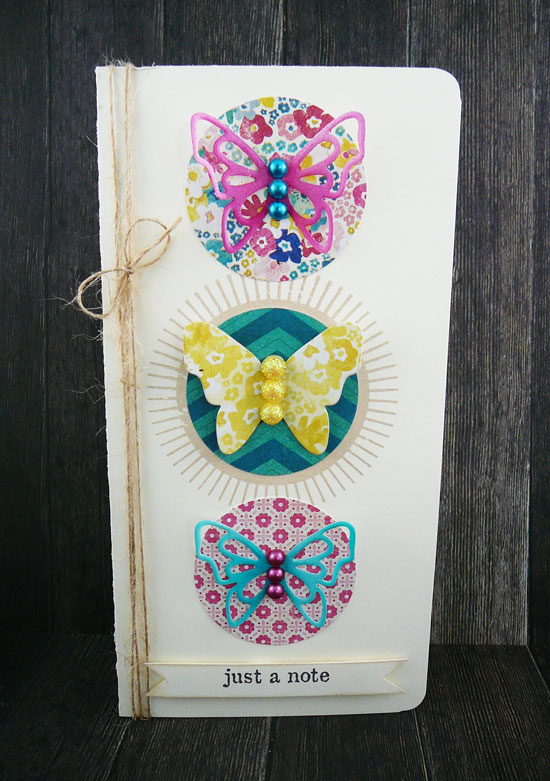 I used new papers from the Crate Paper Maggie Holmes 6×6 pad, punching circles from various patterns. The Flutterbys die set includes four beautiful butterflies. There are two sets of butterflies each with a solid cutout and a detailed overlay. I used the smaller solid butterfly in the middle and cut the detailed overlay from vellum, airbrushed them with Copics, and used them on the two outside circles.