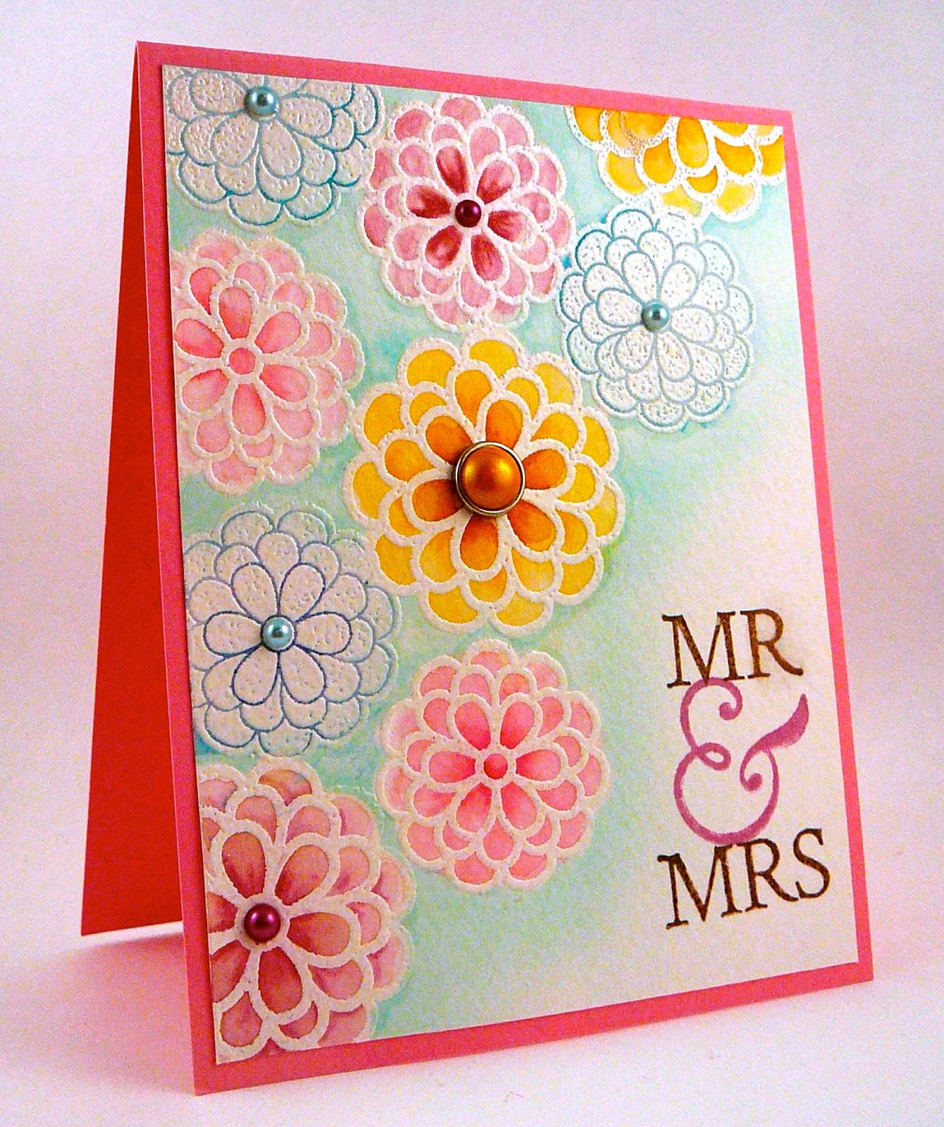 To top off the card I inked up the Mr. & Mrs. stamps (also included in the Happily Ever After set) and added pearls and brads to the center of some of the blooms to make them pop even more.