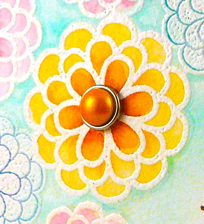 I began by using watercolor paper for my card front, stamping the flowers in Versamark, and embossing with white embossing powder. I watercolored inside each of the blooms with Tim Holtz distress markers. Then I masked all of the flowers and airbrushed around them with Copic BG10. It took a bit of time to achieve the end result, but I really love the softness that the watercoloring and airbrushing gives! Here’s a closeup: