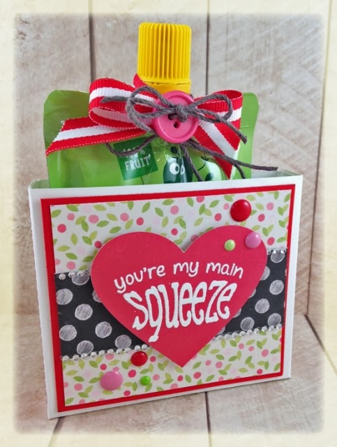 For my first treat I used the My Punny Valentine stamp set. This set includes several sentiments and images designed specifically for Valentine treats. After Madi’s Valentine’s Day party last year I made note of all the crafty valentines she received and I was inspired to create this stamp set. For my treat I used one of those ‘squeeze’ applesauce packets. If you’re a mom of a child under 5 then you certainly know about these squeezable wonders. What child doesn’t love applesauce? And mom’s love it too because it’s healthier than chocolate and mess-free in the squeezable pouch!