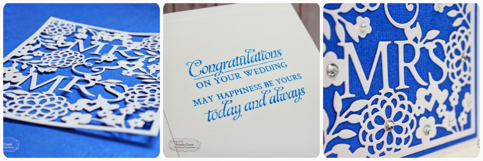 Wanda’s notes: My card is made using the Mr. and Mrs. Cutting Plate cut out in crisp, bright, white paper, and layered on a lovely blue. I added bling and pearls to make it more festive and fancy. This look is so elegant and classy.