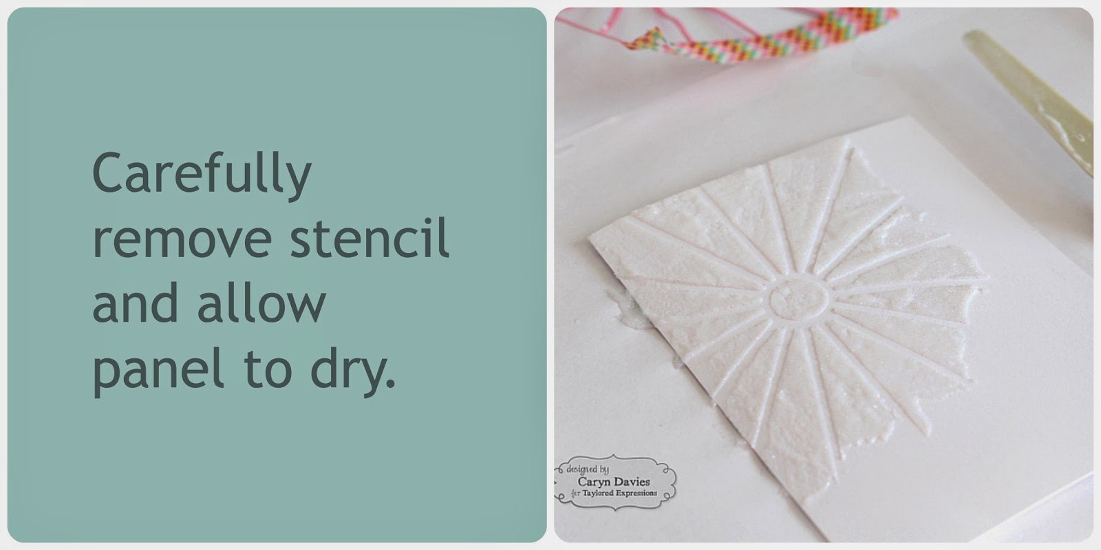 Caryn’s Notes: Now comes the fun bit! Here I’ve used Sparkle Medium (which is a gel-like paste with glitter through it) but the same effect could be achieved with standard embossing paste and fine glitter. I have a little spatula which I use as a spreader but an old credit card or even a sturdy piece of card will work. Smooth the paste over the area where you want it, carefully remove the stencil and discard. Then set it aside to dry.