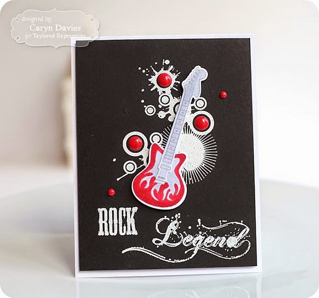 Caryn’s Notes: The red guitar was stamped in grey and then colored with Copic markers and finished with a layer of sparkle using a clear Wink of Stella brush pen. Finally, the guitars were placed onto the panels, which were then adhered to the fronts of the card. For a finishing touch and an extra bit of bling (can’t help myself) I chose some co-ordinating Doodlebug Sprinkles and placed them on the background.