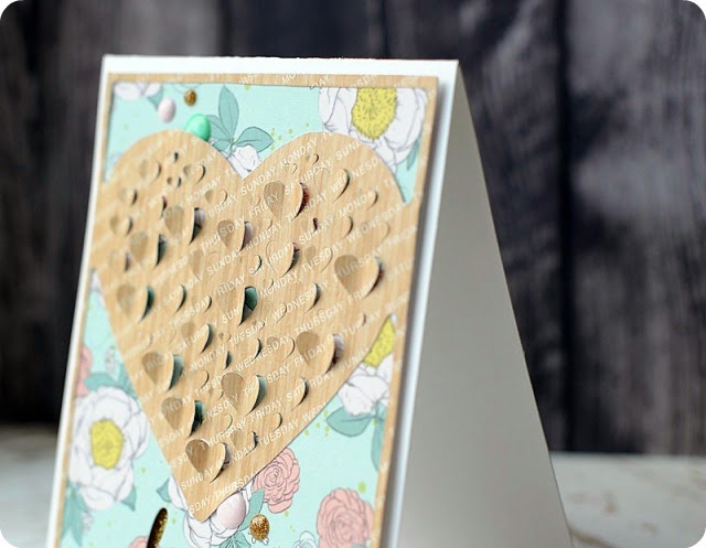 it. Note: The cutting plate does not cut out the large heart (it may be die-cut using TE’s Heart Stacklets) — I love that I can create so many different looks with one cutting plate! I wanted the patterned paper to be more substantial on this card, so I just lightly traced them in pencil and fussy cut with a hobby knife and precision tip scissors to create a frame.