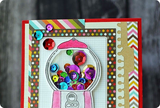 Versafine ink and let it set for a couple minutes. Then I just added watercolor to it in reds & greys. I die-cut the gumball machine,