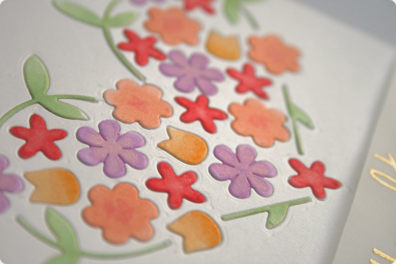 The die-cut flowers and stems were colored using Copics and then inlaid into the die-cut panel.