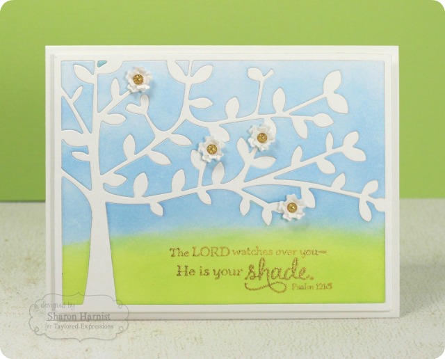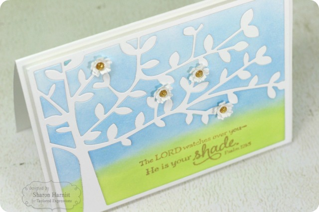 Sky onto the background pieces, creating grass and sky.Next, I gold heat embossed the beautiful Shade Tree
