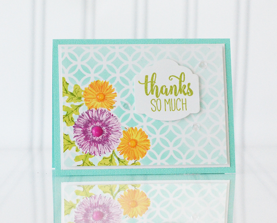 The stenciled background with the flowers is all one layer so it took a bit of masking to accomplish this card. I started by stamping the purple flower in three coordinating inks (Lulu Lavender, Sweet Plum, and Lilac Posies) using my Stamp-a-ma-jig to line up the layers. Then I masked the large flower and stamped the two smaller flowers in three coordinating inks (Dandelion, Cantaloupe, and Tangelo). I finished by stamping the leaves in two coordinating inks (Pear Tart and Bamboo Leaves).