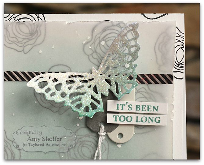vellum.For my focal point, I die-cut a Sugar Cube butterfly using the large Elegant Butterfly Overlays die. I sponged on some Evergreen Bough Distress Ink, fading out at the top, coated the die-cut with Glossy Accents,