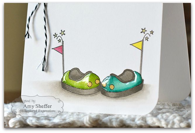 adorable pair of bumper cars and darling sentiment from Adventure Land. After using Memento Tuxedo Black ink to stamp the cars onto a card-size panel, I colored with my Copics. I gave the cars a shiny paint job by coating them with Glossy Accents.Next, I added a patterned paper border along the top, using patterns from Taylored Expressions’ Build A Scene paper pack, along with the Reach for the Stars border die. I embellished the die-cut star border with some Studio Calico Wood Veneer Stars, too.