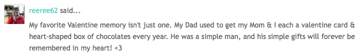 Thank you to everyone for sharing your Valentine’s memories! It was so much fun reading about everything from handmade cards to romantic getaways. Plus, lots of V-Day babies out there!