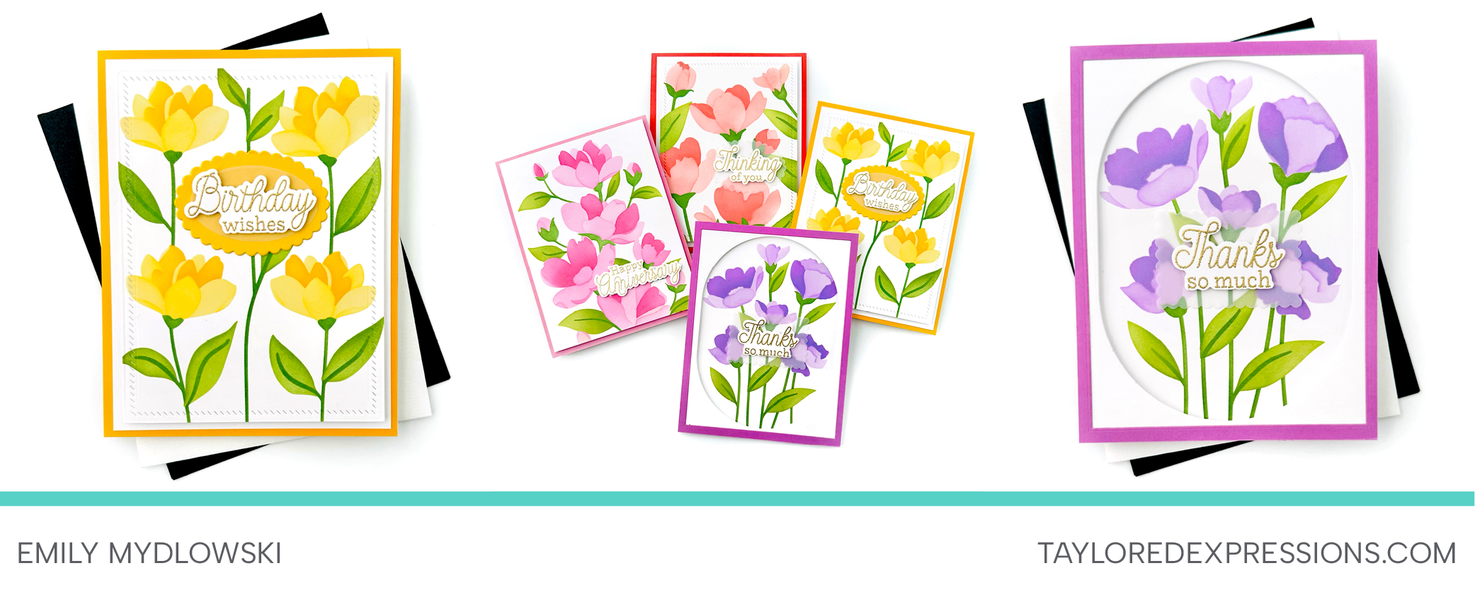 Emily Mydlowski created a rainbow of cards with Timeless Blooms, using a unique color sequence in each quadrant to craft four cheerful cards!
