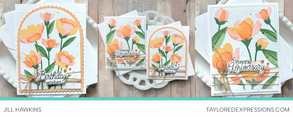 Jill Hawkins made beautiful peachy and orange flowers with Timeless Blooms! She added subtle visual interest by scoring the card base and using an arched cutout for one card and used a piercing plate for the other card.