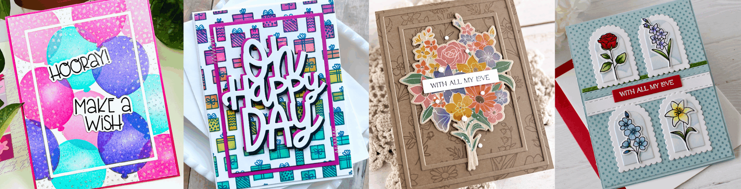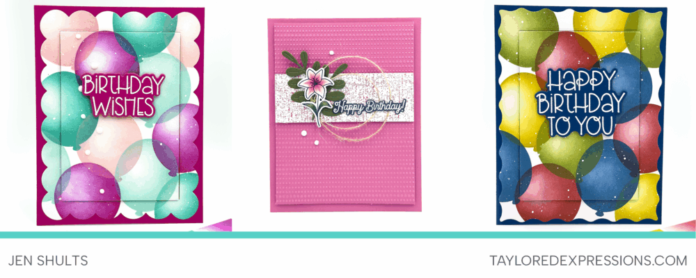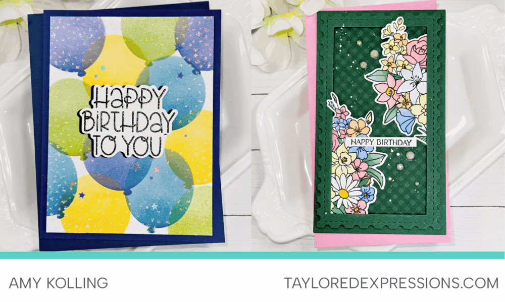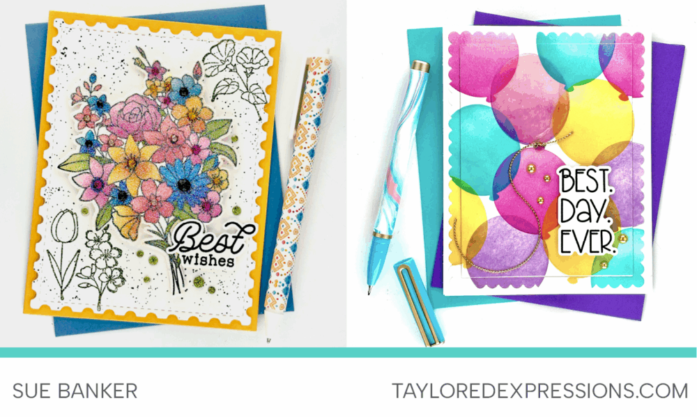 TE Designer Sue Banker doesn’t have a blog, but her projects are too good not to share! She created with both the Another Year in Bloom Bundle and the Palette Playbook Bundle. Her floral card features the full bouquet dressed up with sparkly mediums and splatter for extra detail, while her balloon card is bright, colorful, and full of celebration.