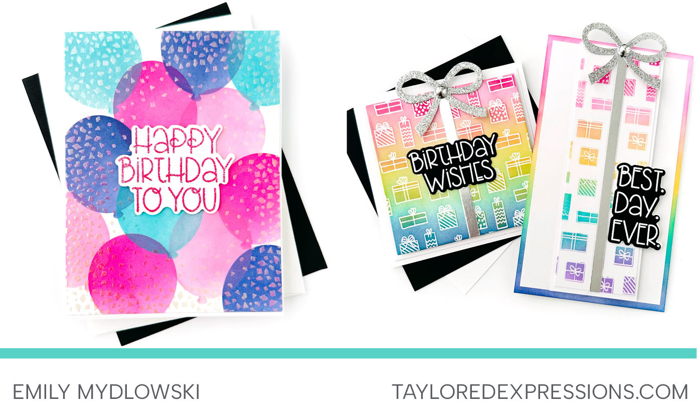 Emily Mydlowski created a sweet birthday card using the Palette Playbook Bundle, and she also put the $200 Gift with Purchase Present Parade Stamp and Stencil to work on two cheerful rainbow cards. It’s such a fun mix of color and celebration in every project